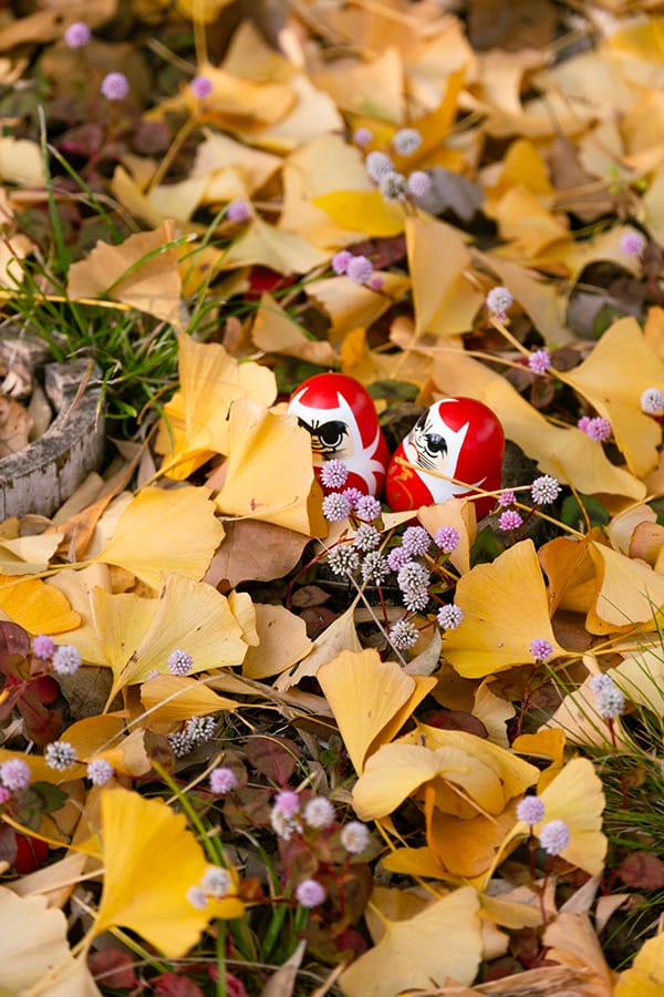 There is something inherently sacred about the morning silence in Nara’s temples. Away from the usual crowds, Daian-ji offered up this quiet scene: two small Daruma dolls tucked into a vast ocean of fallen ginkgo leaves.